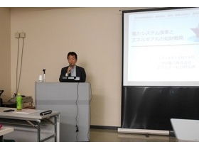 続いて、前常務理事・味能様から「電力システム改革とエネルギア丸の知財戦略」の演題で昨年4月の広域的な送配電線運用の拡大、今年4月からの小売の全面自由化、平成32年に予定されている送配電部門の法的分離という「電力システム改革」と、エネルギア丸の知財戦略(2002年以降の具体的な取組とその成果、新・活用戦略)についてお話し頂き、知財活動が事業や地域の発展に貢献していく内容にて力強く締めくくられた講演を頂きました。