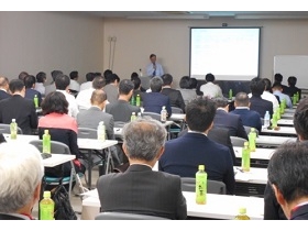 続いて、前常務理事・味能様から「電力システム改革とエネルギア丸の知財戦略」の演題で昨年4月の広域的な送配電線運用の拡大、今年4月からの小売の全面自由化、平成32年に予定されている送配電部門の法的分離という「電力システム改革」と、エネルギア丸の知財戦略(2002年以降の具体的な取組とその成果、新・活用戦略)についてお話し頂き、知財活動が事業や地域の発展に貢献していく内容にて力強く締めくくられた講演を頂きました。