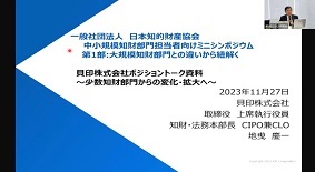 第2部は、「少数知財研究会からの学び」の視点から、JIPAの少数知財研究会の成り立ち、活動の意義、中秋規模知財部門のあり方について語っていただき、更に、昨年度、関東少数知財研究会の月例WGにて取得したアンケート結果から、職務発明、知財教育、知財管理システムの状況等に関して、JIPAだからこそ得られる情報を報告していただきました。